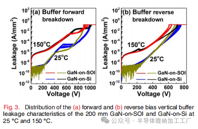(a) 25°C和150°C下,200mm GaN-on-SOI和GaN-on-Si的正向垂直缓冲泄漏特性分布。