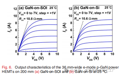 图6. 25°C下,200毫米宽的36毫米e模式p-GaN功率HEMT在(a) GaN-on-SOI和(b) GaN-on-Si上的输出特性。