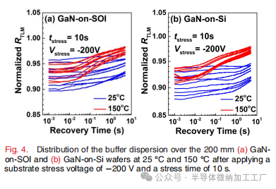在施加基板应力电压-200V并应力持续时间为10秒后,200mm (a) GaN-on-SOI 和 (b) GaN-on-Si 晶圆在25°C和150°C下的缓冲层色散分布。
