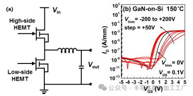 GaN功率系统在单片上的单片集成由于其能够抑制寄生电感、减少芯片尺寸并提高设计灵活性的优势,具有非常大的前景。对于半桥电路的单片集成,其中最重要的要求之一是隔离高侧和低侧器件的基板,因为它们需要连接到各自的源极,并且需要不同的偏置(见图1(a))。因此,在GaN-on-Si上实现HEMTs的单片集成非常具有挑战性,因为这些HEMTs共享一个共同的导电硅基板。如果不隔离基板,图1. (a) 半桥电路简化图;(b) 在GaN-on-Si上HEMT的转移特性,基板偏置从−200 V到200 V,温度为150°C。可以观察到阈值电压(Vth)和驱动电流的严重偏移,尤其是在对Si基板进行负偏置时。