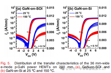 36mm宽的e-mode p-GaN功率HEMTs在200mm (a) GaN-on-SOI和(b) GaN-on-Si上的转移特性分布,分别在25°C和150°C下测量。