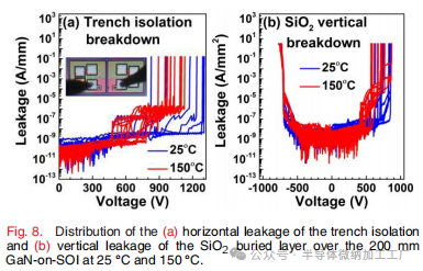 进一步验证了GaN-on-SOI上通过周围沟槽隔离的器件隔离稳定性,如图8所示。图中显示,沟槽隔离的水平击穿电压在150°C时达到约700 V(图8(a)),并且SiO2埋层的正向和反向垂直击穿电压在150°C时均超过约500 V(图8(b))。
