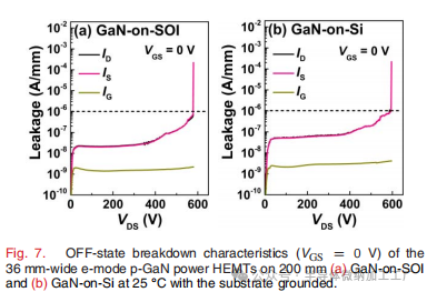 图7. 25°C下,200毫米宽的36毫米e模式p-GaN功率HEMT在(a) GaN-on-SOI和(b) GaN-on-Si上,栅极电压VGS = 0 V时的关断状态击穿特性,基板接地。