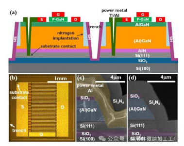 本研究中使用的SOI基板由1070 μm厚的Si(100)承载晶圆、1 μm厚的SiO2埋层组成。图2展示了(a)增强型(e-mode)p-GaN HEMT的示意性横截面,(b)制造的器件的顶视图,以及(c)基板接触的二次电子显微镜(SEM)横截面微图和(d)在200 mm GaN-on-SOI上制造的沟槽隔离的横截面微图。