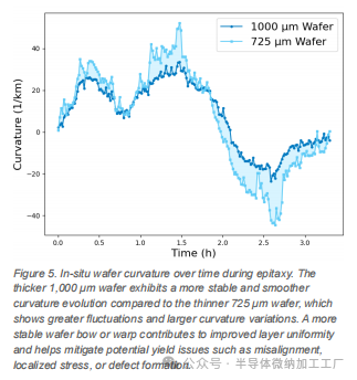 如图 5 所示,较厚的 1,000 微米晶圆相比于较薄的 725 微米晶圆表现出更稳定和平滑的弯曲演变,而薄晶圆则显示出更大的波动和更大的弯曲变化。这表明,增加晶圆厚度有助于增强机械稳定性,并减少在 GaN 外延过程中对弯曲的敏感性。更稳定的晶圆弯曲或翘曲有助于提高薄膜均匀性,并有助于减轻潜在的良率问题,如错位、局部应力或缺陷形成。