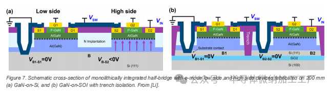 图 7. 单片集成半桥的示意横截面,其中低端和高端器件采用 200 毫米 (a) GaN-on-Si 和 (b) GaN-on-SOI (带槽隔离) 制造。来自 [Li]