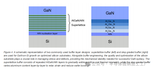 图 4. 两种常用缓冲层设计的示意图:超晶格缓冲层(左)和步进梯度缓冲层(右),用于在优化的硅基板上进行 GaN-on-Si 生长。除了缓冲层工程,硅基板的质量和优化在应力和缺陷管理中也起着至关重要的作用,提供成功的 GaN 外延生长所需的机械稳定性。超晶格缓冲层由重复的 AlGaN/AlN 层组成,逐步解决晶格和热失配问题,而步进梯度缓冲层通过逐层变化铝含量来放松应力并减少晶圆弯曲。
