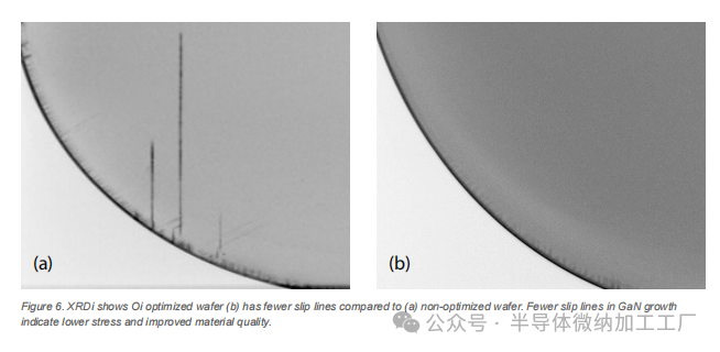 图 6. XRDI 显示优化过 Oi 的晶圆(b)相比于未优化的晶圆(a)具有更少的滑移线。GaN 生长中滑移线较少表明较低的应力和更好的材料质量。如图 6 所示,通过 X 射线衍射成像(XRDI)分析,优化过 Oi 水晶圆(图 6 b)相比于未优化的水晶圆(图 6 a),滑移线显著减少,突显了 Oi 控制对于保持晶圆完整性的重要性。更少的滑移线意味着更好的器件性能和更强的机械稳定性,确保 GaN 应用中更高的可靠性。
