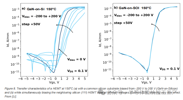 图 8. 在 150°C 下的 HEMT 转移特性 (a) 使用普通硅基片偏置从 -200 V 到 200 V (GaN-on-Silicon), (b) 同时对相邻的硅 (111) HEMT 层施加不同电压偏置 (GaN-on-SOI),显示出几乎没有影响。来自 [Li]