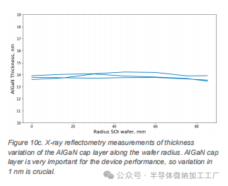 Okmetic Power GaN SOI Substrate晶圆,作为GaN外延生长平台,在IMEC的缓冲层击穿电压测试中,反向偏置下漏电流为10⁻⁶ A/mm²,在25°C时,约750V反向偏置和850V正向偏置时,测得的小面积样品(0.01 mm²)中表现良好。 IMEC对Okmetic Power GaN SOI Substrate晶圆进行的缓冲层扩散测量结果表明,漏电效应极小,最小的曲线展宽表现出优异的器件性能。 使用X射线反射率测量了AlGaN帽层沿晶圆半径的厚度变化。AlGaN帽层对器件性能非常重要,因此1 nm的变化对性能至关重要。GaN-on-SOI在射频设备中的应用