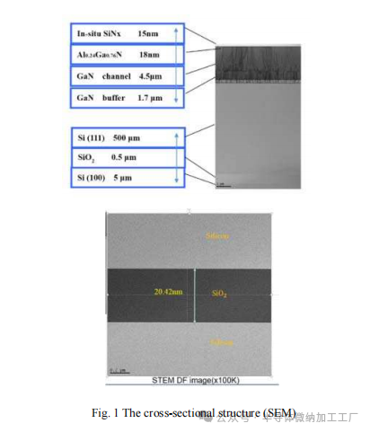 图1展示了所制造器件外延结构的横截面示意图和扫描电子显微镜(SEM)图像。该结构由1.7 μm非故意掺杂(UID)GaN缓冲层、18 nm UID Al0.24Ga0.76N障碍层和15 nm原位SiNx组成。使用了两种不同类型的基板,分别是500 μm的SOI基板和1000 μm的高电阻硅(HR-Si,>6000 Ω/)基板,来生长相同的器件结构。此外,还研究了第三种器件变体——与HR-Si器件相同,但没有15 nm原位SiNx的结构。