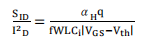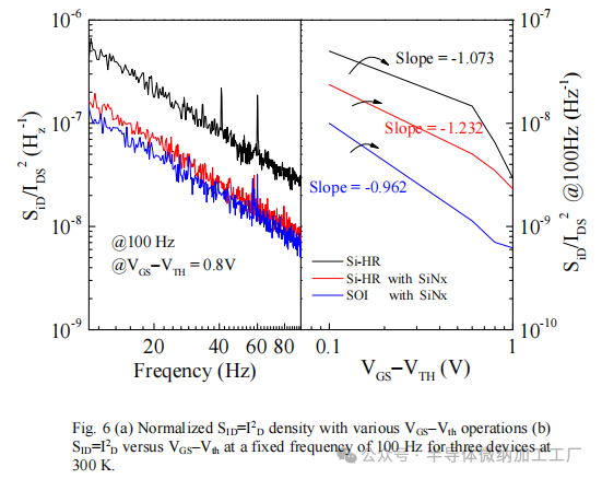 图6(b)显示,传统HEMT的斜率为-1.073,HR-Si基板上的器件为-1.232,SOI基板上的器件为-0.962。这些实验结果表明,SOI基板上的器件中的波动是迁移率波动,因为VGS–Vth与SID=I2D密度的曲线接近-1。载流子在通道内向肖特基结的隧穿是单栅开关器件的主要决定因素之一。当1/f噪声主要由迁移率波动引起时,SID=I2D可以通过以下方程表示: