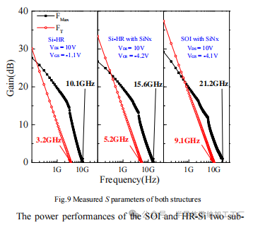 图9展示了2μm栅长器件的射频性能,VDS = 10 V,VGS = −4.4 V时,SOI基板器件的当前增益截止频率(fT)为9.1 GHz,最大频率(fmax)为21.2 GHz。而HR-Si基板器件的fT为5.2 GHz,fmax为15.6 GHz。