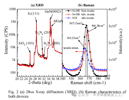 图2(a)显示了AlGaN/GaN异质结构在SOI和HR-Si基板上的2θ-ω X射线衍射(XRD)谱图。这两个样品的曲线显示了清晰的SiO2、GaN、AlGaN和SiNx峰值及其边带,表明样品具有平坦的表面和急剧的异质界面。为了保证由于GaN/Si界面的晶格失配导致的6英寸SOI基板的应力释放现象,对两个晶圆进行了微拉曼光谱测试。如图2(b)所示,SOI基板上的晶圆的E2峰值为565 cm−1,测得的结果与标准自由立GaN薄膜的值(567.4 cm−1)相似。与HR-Si基板上的器件(567.1 cm−1)相比,在HR-Si基板上的样品中GaN层表现出明显的拉伸应力。SOI基板上的薄膜展现了更好的应力释放性能,这有助于提高长期操作的可靠性。