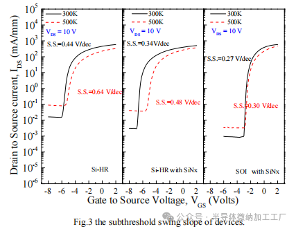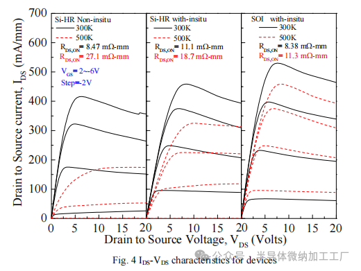 对于图3中显示的SOI基板上HEMT器件的直流性能,相较于HR-Si基板上的器件,亚阈值摆幅(S.S)在300K下从340 mV/dec改善至270 mV/dec。图4绘制了器件的IDS-VDS特性曲线。在HR-Si基板上的器件,压截止电压和最大IDS分别为−5.4 V和465 mA/mm,而在SOI基板上的器件,压截止电压和最大IDS分别为−5.2 V和528 mA/mm。SOI基板上的器件表现出较高的电流密度,这被归因于较低的外延膜应力。