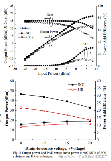 使用原位SiNx器件的基板在900 MHz下进行了测量,并进行了最大PAE匹配调谐。SOI和HR-Si两种基板器件的射频性能对比如图8所示。从图中可以明显看出,SOI基板上的器件表现突出。SOI基板器件的输出功率为18 dBm,PAE为30.17%,线性增益为15 dB。与HR-Si基板器件相比,PAE和增益均有所提升。