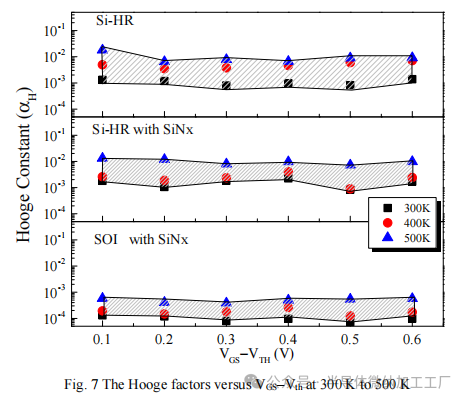 其中,f 是频率,Ci 是栅绝缘体的单位电容,W 是器件的栅宽,L 是器件的栅长,q 是基本电子电荷,αH 是Hooge常数,这是用于区分1/f噪声的另一个噪声参数。如图7所示,测得的噪声支持Hooge的迁移率模型,并且SOI基板上的器件的αH值低于其他器件,在300 K时尤为明显。此外,SOI基板上的器件在不同温度范围(从300 K到500 K)下表现出比其他器件更小的αH变化。