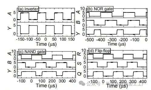 反相器、NOR门、NAND门和触发器是大规模逻辑电路的基础。本文采用RTL来构建这些模块,其中pMOS被5μm宽的弯曲2DEG电阻代替,逻辑nFET是p-GaN门HEMT,其窄WG为6μm,LGD为1.5μm,如图11所示。制造的模块被封装并进行了开关测试。图12显示了这些波形完全符合图11中的真值表。