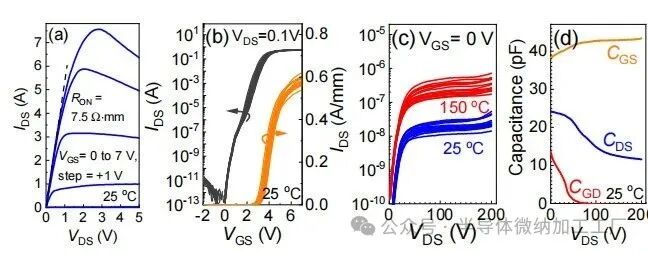 图7. (a)输出特性,(b)转移特性,(c)OFF状态漏电特性,以及(d)C-V特性,展示了在200毫米GaN-on-SOI衬底上制造的40毫米p-GaN门功率HEMT。该器件表现出7.5Ω·mm的低Ron,>3V的均匀高Vth,以及<1µA/mm的低OFF状态漏电。图8. (a)测量HEMT动态RON的即时脉冲I-V波形,和(b)归一化的动态RON偏移(限制在±10%以内)C. MIM电容器
