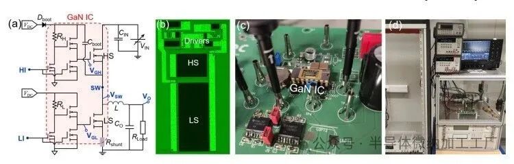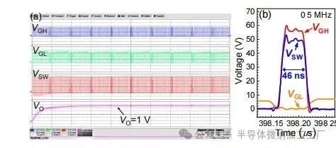 图16. (a)用于降压转换器的GaN IC集成半桥和驱动器的示意图,(b)制造的集成驱动器半桥的照片,(c)测试板,和(d)测试设置。图17. 集成驱动器半桥的200V开关波形VGH、VGL和VSW。由于沟槽隔离,背门效应得到了完全抑制。图18. (a)48V至1V单级降压转换器的瞬态开关波形,其中VO逐渐稳定在1V,证明了GaN IC的功能,(b)转换器的详细单脉冲,突出显示了46ns的窄脉冲宽度和2.2%的低占空比,这保证了0.5 MHz的高开关频率。图19. (a)单片集成全GaN降压转换器的设计,包括半桥、驱动器、死区时间控制、比较器、误差放大器和斜坡生成器,(b)基于imec器件模型和PDK(过程设计工具包)通过Cadence进行的仿真波形。