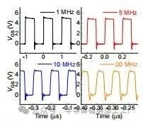 图13. (a)双脉冲测试(DPT)电路的示意图,(b)集成驱动器和功率HEMT的GaN IC封装,和(c)印刷电路板(PCB)。图14.不同频率下(最高达20 MHz)的VGS开关波形。图15. 带集成驱动器的HEMT的DPT开关波形和电流处理能力。G. 集成驱动器的半桥