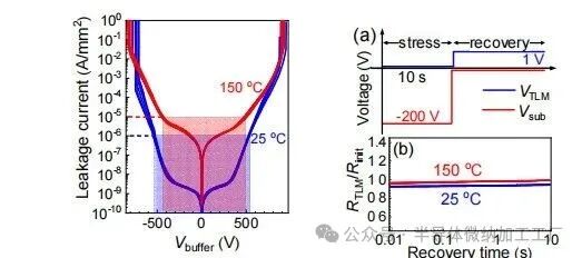 图5. 25°C和150°C下正向和反向缓冲垂直漏电特性。在25°C和150°C下,按照1 µA/mm和10 µA/mm的标准,击穿电压分别超过450V。图6. (a)测试过程和(b)缓冲层分散的瞬态波形,与未应力的TLM相比,分散度被很好地限制在±10%以内。B. HEMT