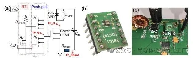 SBD在功率集成电路中广泛用于整流器、升压二极管、自由轮回二极管、保护二极管等。SBD的阴极是与HEMT源/漏相同的欧姆接触,而阳极是通过去除p-GaN层并打开钝化层后,再进行阳极金属沉积,如图2所示。图10(a)和(c)分别显示了集成二极管的照片和正向特性,其VF为1.24V。本文中的SBD专门设计为半桥中的反并联二极管,如图10(e)所示。在半桥的死区时间,LS必须反向导通,此时VGS = 0V,VDS为负。然而,LS上的电压降非常高,如图10(c)所示,导致一些死区损耗。相比之下,如果在LS旁边连接一个反并联二极管,如图10(b)和(e)所示,电流可以通过二极管流动,其电压降为1.24V,如图10(d)所示,远低于前一种情况的5V。