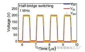 半桥集成电路如LLC电路和主动钳位反激(ACF)电路在功率转换中广泛应用。GaN IC示范中具有非对称半桥和集成驱动器的示意图和照片分别如图16(a)和(b)所示,测试PCB板和设置如图16(c)和(d)所示。首先,在测试板上执行200V半桥开关测试,通过断开L、CO和Rload的输出端。向两个驱动输入端发送具有40ns死区时间的两个1 MHz非重叠信号HI和LI,并监测VGH、VGL和VSW的波形。图17中的快速而稳定的开关波形证明,限制半桥集成的背门效应已被彻底克服。