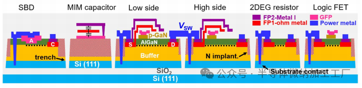 GaN-on-SOI与深沟槽隔离技术对GaN功率集成电路(IC)具有很大的潜力,突显了消除背门效应、有效隔离、抑制寄生电感和减小面积的优势【1】【2】。全GaN功率集成电路需要多种模块,包括半桥、二极管、电容器、驱动器、死区时间控制、电平转换器、脉宽调制(PWM)、诊断与保护电路、调节器、带隙参考、升压电路等。许多研究工作已经致力于将这些单一或多个模块集成在GaN-on-Si上【3】 -【7】。然而,对于传统硅基底上的全GaN集成电路来说,最具挑战性的问题首先是缺乏有效的隔离,这会在半桥中引发背门效应;其次是缺乏GaN pFET,这成为集成高性能逻辑电路的瓶颈。