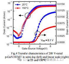 图4. 200V额定p-GaN HEMT的转移特性,在25°C和150°C下,分别以半对数坐标(左)和线性坐标(右)表示。
