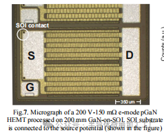 图7. 在200毫米GaN-on-SOI衬底上加工的200V-150 mΩ电子模式pGaN HEMT的显微图。SOI衬底与源极电位相连(如图所示)。