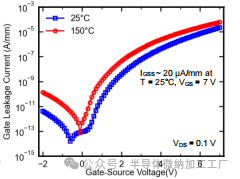 图6. 电子模式p-GaN HEMT在25°C和150°C下的栅极漏电流。