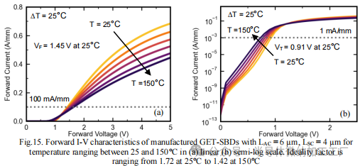 图15. 制造的GET-SBD的正向I-V特性,LAC = 6 µm,LSC = 4 µm,在25°C到150°C之间的温度范围内