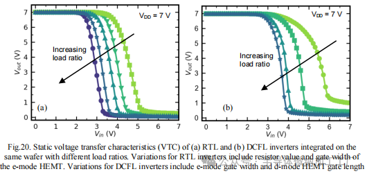 图20. (a) RTL反相器和(b) DCFL反相器的静态电压传输特性(VTC),它们集成在同一晶圆上,具有不同的负载比。