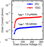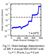 图11. 200V离子模式MIS-HEMT的漏极漏电流特性,器件尺寸为:LG = 1.30 µm,LGD = 6 µm。