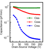 图10. 200V、150 mΩ电子模式功率HEMT的归一化电容特性。