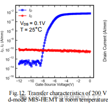 图12. 200V离子模式MIS-HEMT在室温下的转移特性。