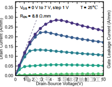 图5. 200V额定p-GaN HEMT的输出特性,器件尺寸为:LGS = 0.50 µm,LG = 1.30 µm,LGD = 5.50 µm。