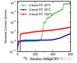 图16. 两种不同阳极场板配置的GET-SBD反向漏电流特性。