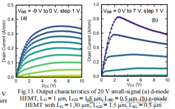 (b) 电子模式HEMT,器件尺寸为:LG = 1.30 µm,LGD = 1.5 µm,LSG = 0.5 µm