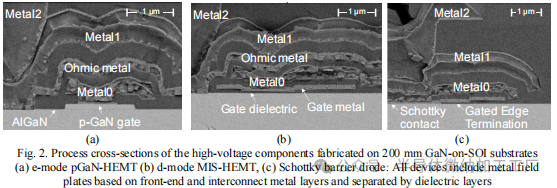图2. 在200毫米GaN-on-SOI衬底上制造的高压组件的工艺横截面图