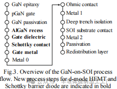 图3. GaN-on-SOI工艺流程概述。离子模式HEMT和肖特基势垒二极管的新工艺步骤以粗体显示。