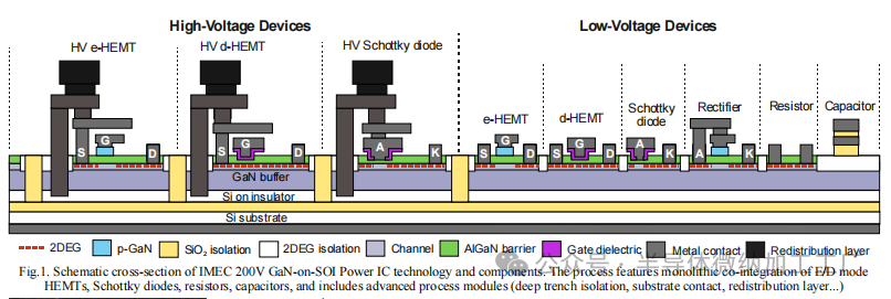 图1. IMEC 200V GaN-on-SOI功率IC技术及组件的示意横截面图。该工艺特点是将E/D模式HEMT、肖特基二极管、电阻、电容进行单片共同集成,并包括先进的工艺模块(深沟道隔离、衬底接触、重分布层等)。