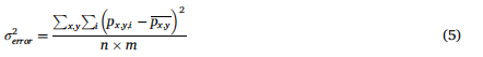 其中,px,y,i是在位置 (x,y)(x,y) 处第 ii 次测量的值;pi是所有位置上第 ii 次测量的平均值;nn 和 mm 分别是测量位置的总数和重复次数。由测量噪声引起的标准偏差 σerror被计算为: