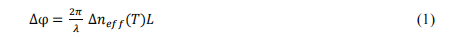 。从该图中,我们可以估算出为引起传播的基本TE模的π相位变化所需的波导核心温度变化(dT)。相位变化与有效折射率变化之间的关系可以从公式(1)中得到,其中L是波导加热部分的长度,λ是工作波长。