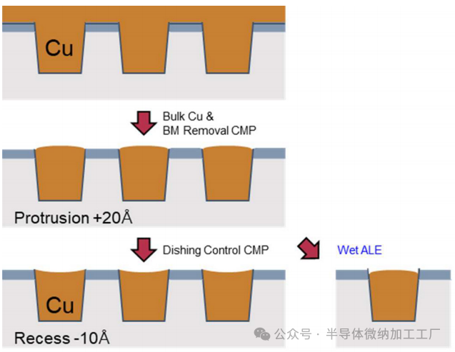 图2. 测试样品准备的CMP过程流程。采用带有铜突出部分的样品来研究湿法ALE过程,而准备了CMP凹陷样品用于对比。