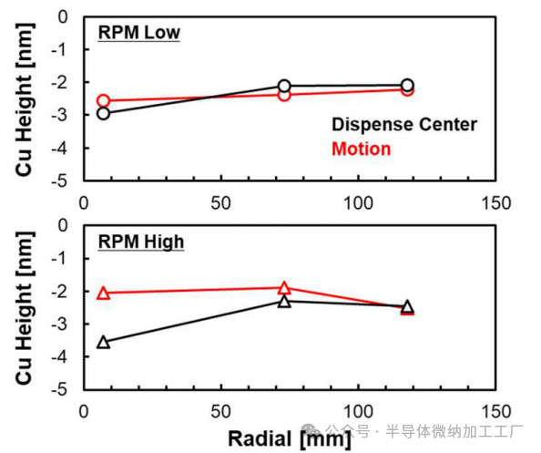 我们在开发的系统中引入的主要概念之一是允许晶圆表面在分配步骤中经历不同的分配环境。也就是说,分配臂的位置可以是固定的,也可以是移动的。这一特性与重要的工艺参数一起,决定了铜表面形貌的晶圆内变化。引入这种控制功能的主要原因是为了实现均匀的铜凹陷轮廓,因为进入的晶圆可能具有不同的晶圆内变化,导致中心和边缘区域的铜高度与初始状态存在差异。进一步解释,它被设计为可以调整各种分配参数,并实时补充初始的凹陷轮廓,使得中心高的区域可以局部地更加蚀刻,以匹配边缘区域的凹陷形貌,反之亦然。图5总结的结果支持了我们的发现,表明不同的分配运动导致了不同的铜凹陷。结合转速(RPM)参数,可以建立大约3 Å/周期的中心与边缘差异,这意味着在5次湿法ALE工艺周期后,初始高度差异可补偿至约1.5 nm。
