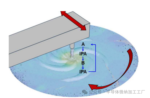 本原型系统的主要组成部分包括可调转速的 300 毫米真空吸盘、每种化学物质流速控制的自动分配模块,以及带有示意图的可运动分配臂(见图 1)。拥有这些关键组件后,我们能够无缝地进行多周期操作,包括化学 A → IPA → 化学 B → IPA 的顺序。