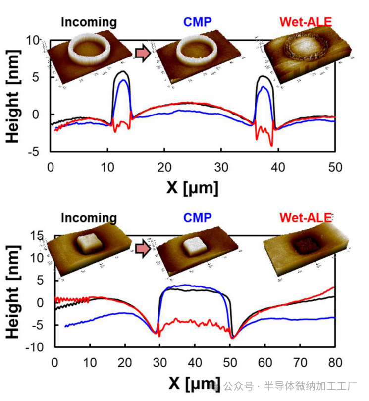 在下一代器件架构的无缝混合键合技术中,面对各种不同的工艺和设备挑战,Cu/介质的表面形貌控制被认为是最重要的方面。在本研究中,我们报告了一种创新工艺的能力,该工艺弥补并缓解了当前CMP工艺的局限性,后者被认为是成功进行3D集成的唯一选择。本研究的实验结果表明,通过湿ALE工艺的工艺创新,实现了对晶圆级集成的铜凹陷形貌进行精确的、约0.5 nm/周期的可控性。此外,除了它在铜垫尺寸和间距小于0.4/0.8 μm时实现铜凹陷目标的纳米级范围的作用外,我们还探索了该工艺的多功能性,可以通过基于运动的化学分配模式实时控制进入的凸起或凹陷轮廓。我们的结果表明,尽管湿ALE工艺并不能单独作为一个普适工具,但在细化铜凹陷和消除CMP后晶圆内的均匀性方面,湿ALE工艺具有良好的前景。