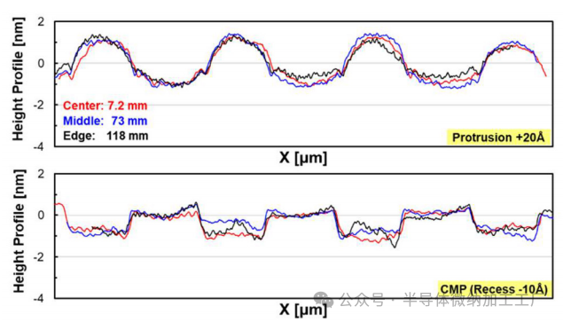 图 3 显示了上述测试载体的 AFM 线轮廓,其中分别具有 +20 Å 的突出和 -10 Å 的凹陷。为了追踪晶圆内的均匀性,至少使用 AFM 扫描了测试载体晶圆中的三个点,沿径向方向测量,7.2 mm、73 mm 和 118 mm 分别代表晶圆的中心、中部和边缘位置。每个实验案例中都测量并获取了 Cu 垫凹陷信息,以分析和优化工艺条件,达到目标凹陷值。对于 AFM 数据的后处理,我们应用了一个内部代码,跟踪整个扫描区域内的所有 AFM 线轮廓。Cu 垫和介质区域根据峰-谷评估进行分类,并通过计算相邻峰之间的高度差来得出 Cu 凹陷值。需要注意的是,当前的内部代码能够检测到每个介质区域和 Cu 垫的中心,并在执行峰-谷评估时进行平均。表面高度差结果以平均值和范围值呈现,并基于统计数据进行讨论。